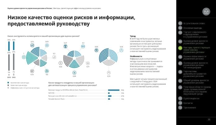 Тренд В 2019 году не было существенных изменениях в инструментах, которые организации используют для оценки рисков. Почти треть организаций используют инструменты моделирования и количественной оценки рисков. Особенности Неформальные и интуитивные методы практически не применяются в организациях всех отраслей. Многоотраслевые холдинги — лидеры в использовании инструментов моделирования и количественной оценки рисков. Шестьдесят четыре процента организаций с… Читать далее Низкое качество оценки рисков и информации, предоставляемой руководству.