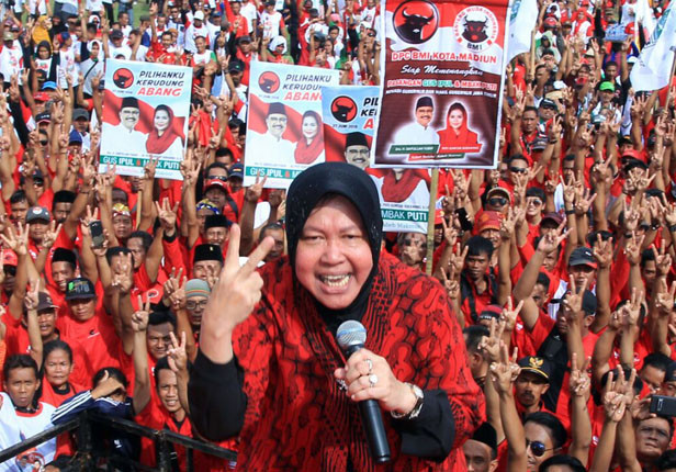 Wali Kota Surabaya Tri Rismaharini menjadi juru kampanye di Lapangan Gulun, Madiun, Kamis (21/6). Risma mengingatkan kepada para kader dan simpatisan agar tidak lupa mencoblos nomor urut 2.