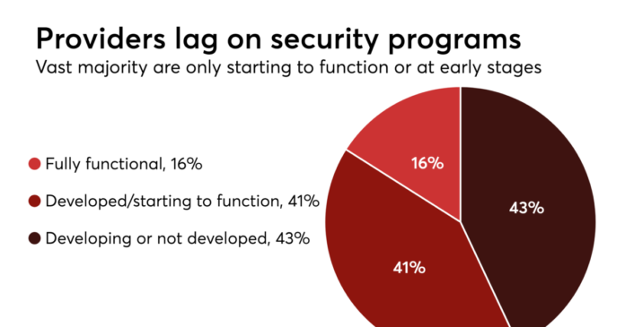 However, many organizations are not fully prepared for current or future threats. A 2017 study by KLAS Research and the College of Healthcare Information Management Executives (CHIME), found that only 16 percent of the providers surveyed reported that their cybersecurity program was “fully functional.” Another 41 percent reported that their security program was developed or starting to function, and 43 percent reported that their cybersecurity program was developing or not developed.